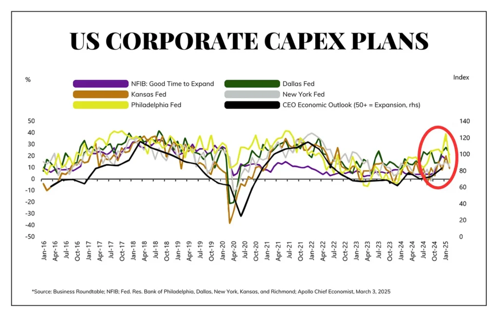 - Nearly all indicators of corporate capital expenditure plans reversed in February, after rallying higher post-election. Whether some of this is ambiguity over tax reform plans or the general threat of tariffs or something else (including something that proves not to be long-lasting), we shall see
