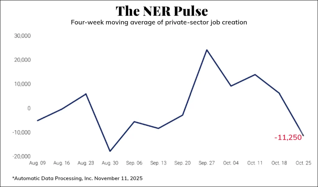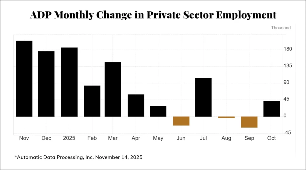 And what has ADP been telling us this year about the state of private sector employment growth? More or less – that there hasn’t been any. The numbers began to decline at the beginning of 2025 and then went negative this summer, basically reflecting a near-zero number from June through October.