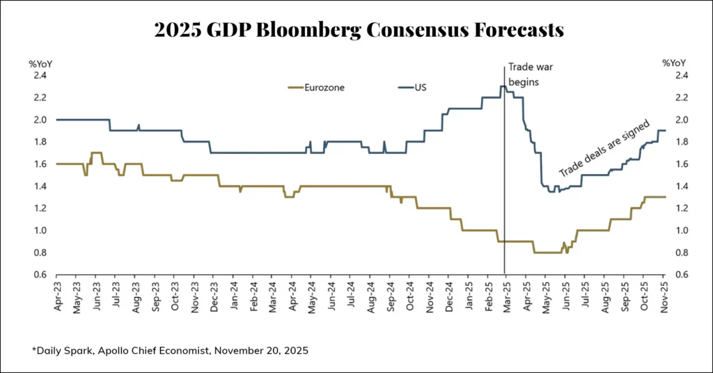 Here you see how consensus forecasts for economic growth (all net of inflation) were picking up after the election, then fell like a lead balloon after “Liberation Day,” and have since modestly recovered, ending somewhere around +1.9% on the year.